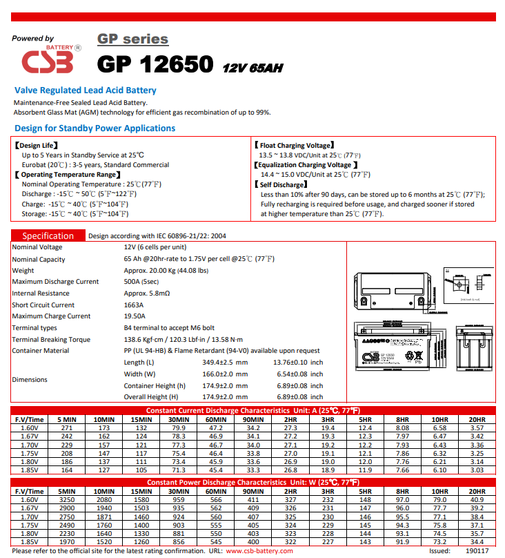 | CSB蓄電池GP12650/12V65AH產品介紹∶ | |